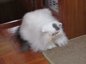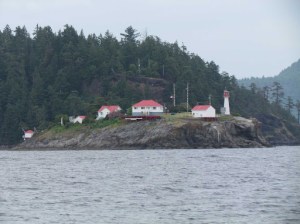 Once we turned toward Ballenas, it continued to be uncomfortable as we were now rolling in 2-3 foot following seas. It wasn’t very windy, just lumpy, and very gloomy overcast. By the time we reached Ballenas, our kitties were huddled up wondering what in the world was going on! Us too! When we passed Ballenas Island and turned toward Texada, the boat was rolling miserably and many things began rattling around in the cupboards. That was enough, and we turned to go with the seas, and changed our destination to Comox.