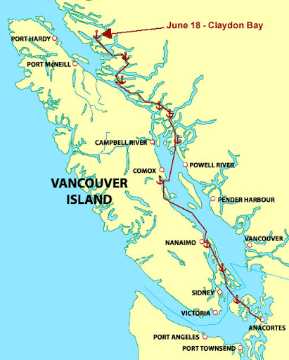 As we approached Claydon Bay, we encountered numerous floats from crab pots, and they looked like commercial floats. What a surprise to find even more floats in the Claydon Bay anchorage! There was only one boat here when we arrived, but they hoisted their anchor and left shortly after we anchored, and we have the entire anchorage to ourselves. In past years, we have usually seen, on average, about 8 or more boats anchored in Claydon Bay. Don’t know if it’s because of the crab pot floats or just not many people coming this way today. It’s still early in the season.