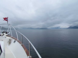 We turned in to Sunderland Channel and found a layer of ground fog on the water ahead. We watched a mega yacht emerge from the fog…a Westport 161 called EWIVA, with a helicopter on the boat deck. For a while, all we could see was their bridge deck, then the enormous boat appeared to our starboard. It left a rather nasty wake.