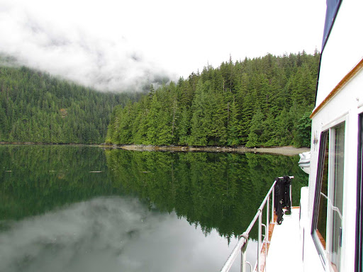 It was calm and lightly raining when we got up this morning in Potts Lagoon. We left at 0700 to catch the slack in Chatham Channel. We headed down Clio Channel, watching commercial shrimpers and crabbers setting their pots for the day. The rain increased and fog developed as we passed Lagoon Cove Marina. We had an easy transit of Chatham Channel even though the visibility was reduced, and the rain stopped when we entered Havannah Channel. It was still calm…so we decided to continue on to get the Johnstone Strait passage behind us.