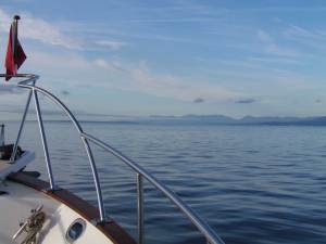 | Georgia Strait was quite calm when we started across (Nanaimo ahead in the distance) |