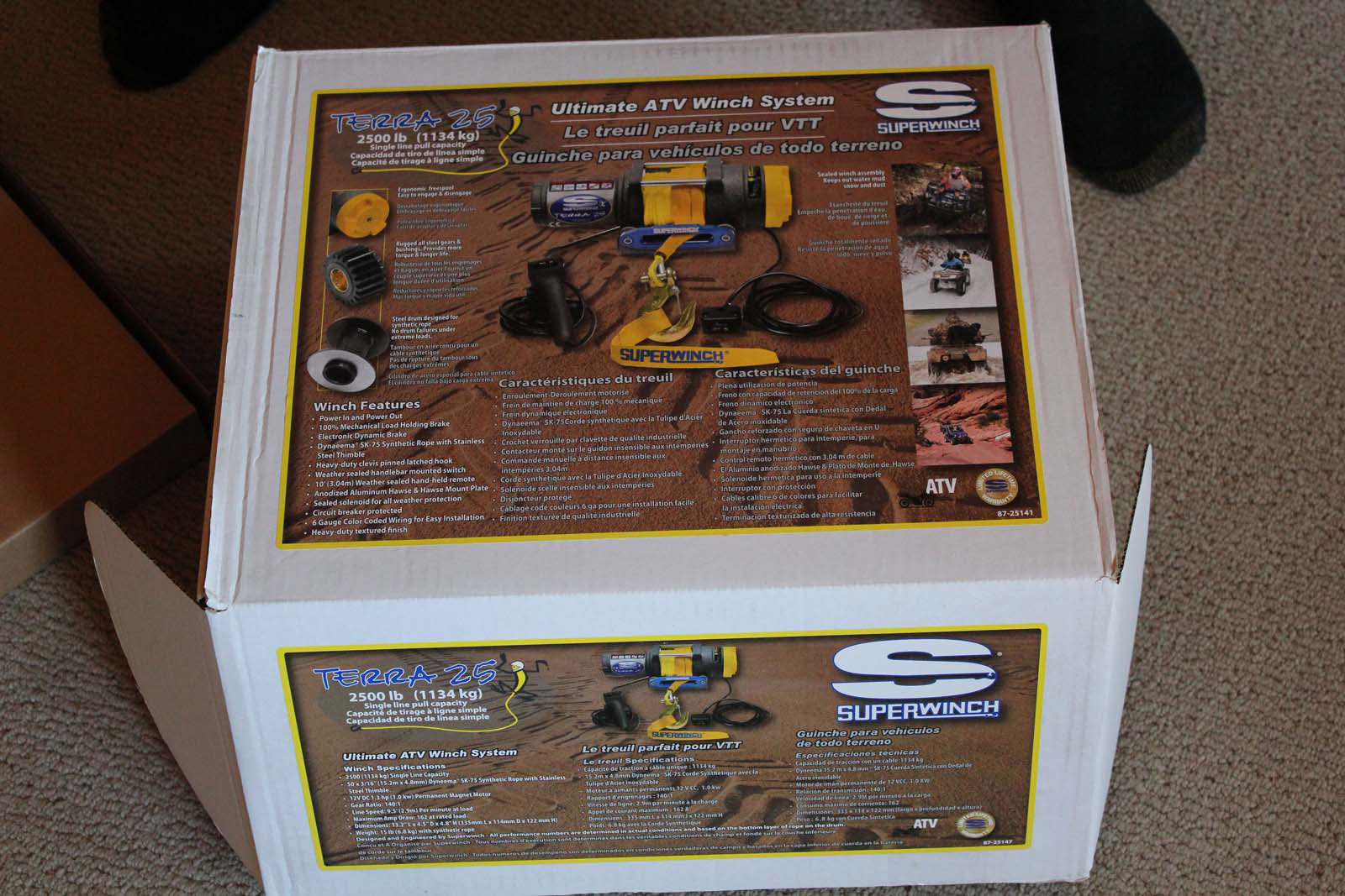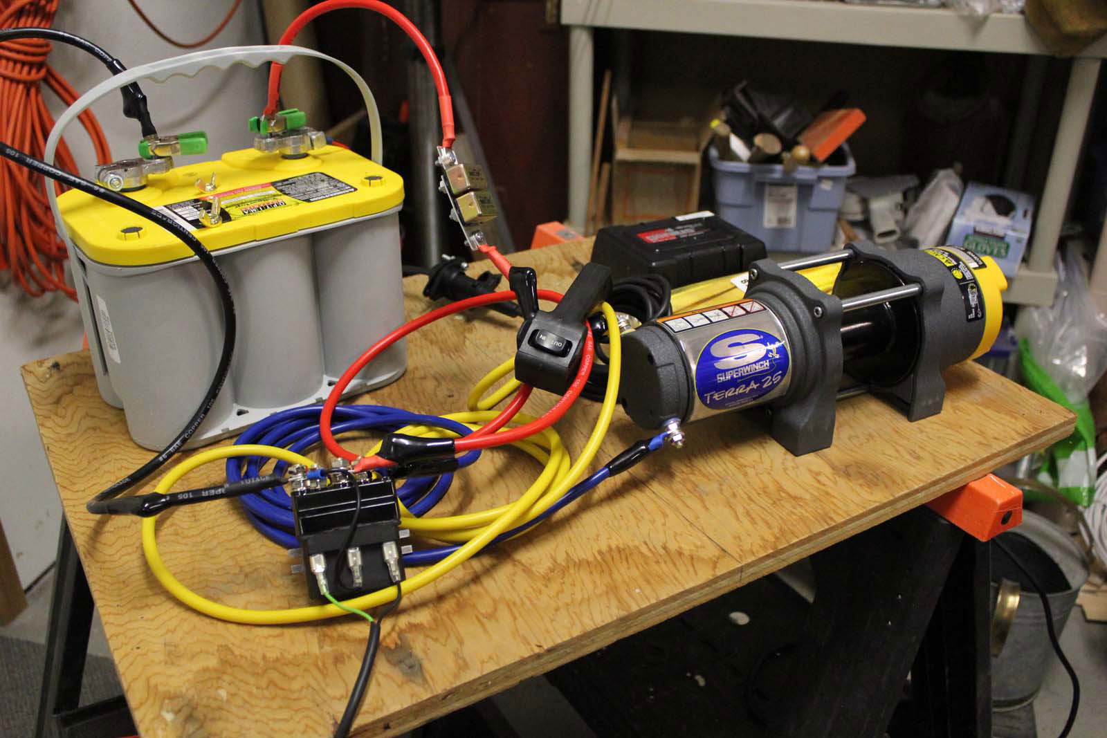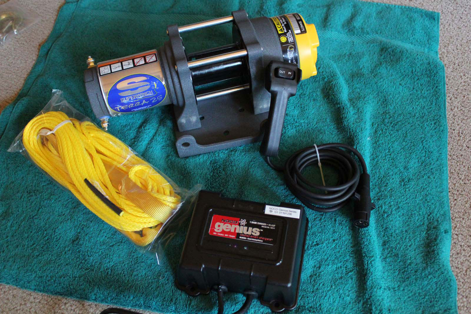 We now have gathered all the piece parts for replacing our manual dinghy-lifting winch with a new electric version. The Superwinch and battery charger that we ordered from Amazon arrived this week, and Jim bought the Optima battery at a local Bend auto supply store.