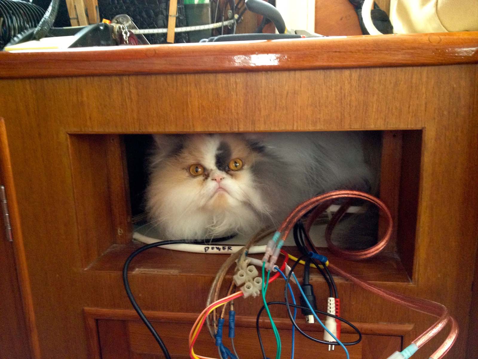 We bought a Sony FM/AM Compact Disc player, model CDX-GT56UI CD Receiver with USB input. This unit fits in the same cabinet as our previous Sony. Jim disconnected the old player this morning and when he put in the new one, he discovered that the wiring was the same. What an easy installation! The only delay was getting Rosie out of the space…since she jumped into the open cabinet as soon as the old CD player was removed! Cats just love small spaces.