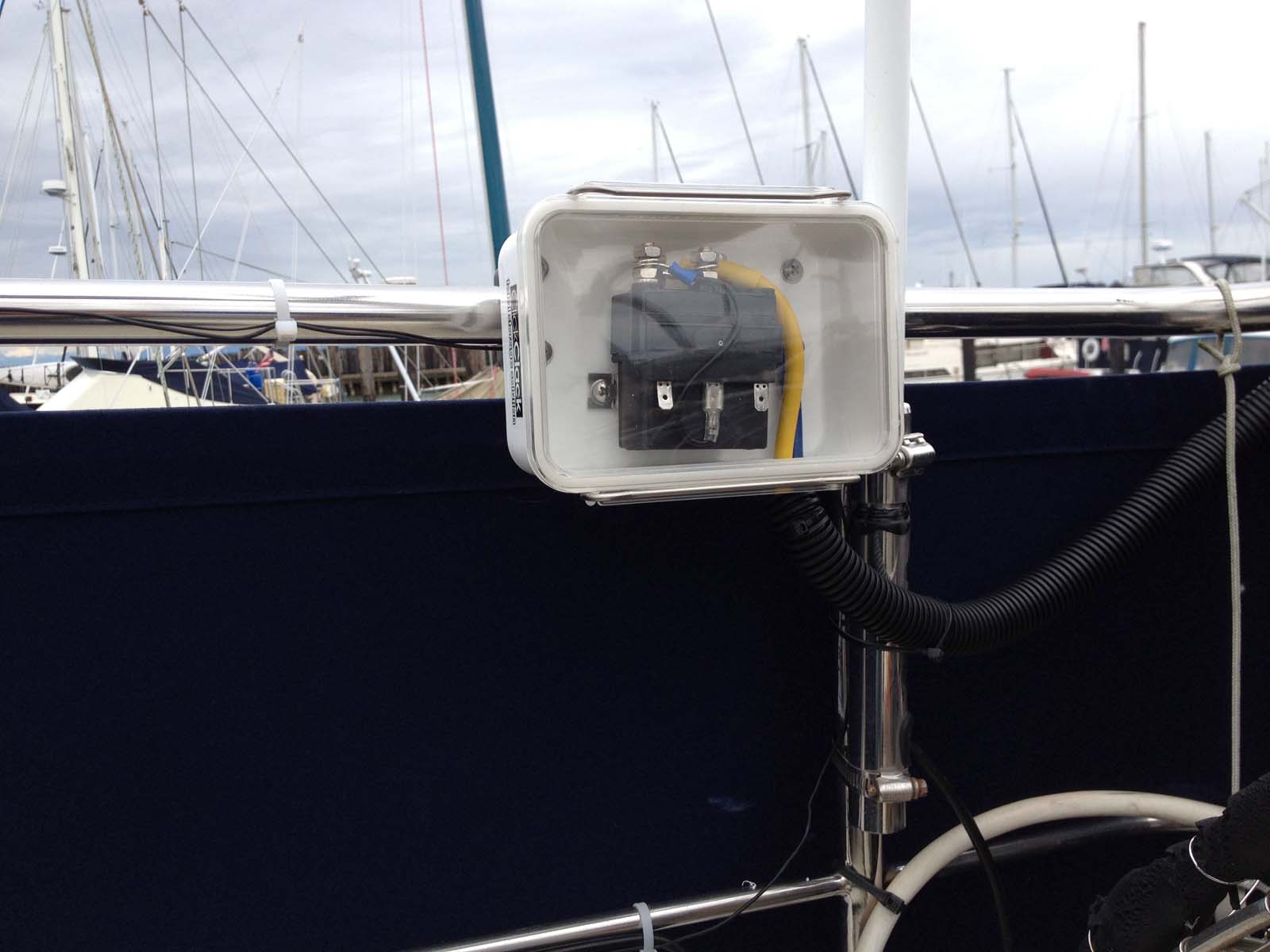 We found a Pelican-like waterproof box at West Marine for housing the solenoid. The box is made out of polycarbonate and measures 6”x5”x2”. Jim fastened it to the starboard aft railing on our flybridge, near the mast and just above where the dinghy is stored on deck.