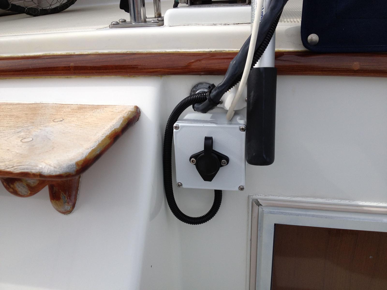 A close-up view of the plug-in for the Superwinch remote control, mounted in the junction box on the cabin, and with the wiring installed that connects it to the solenoid.