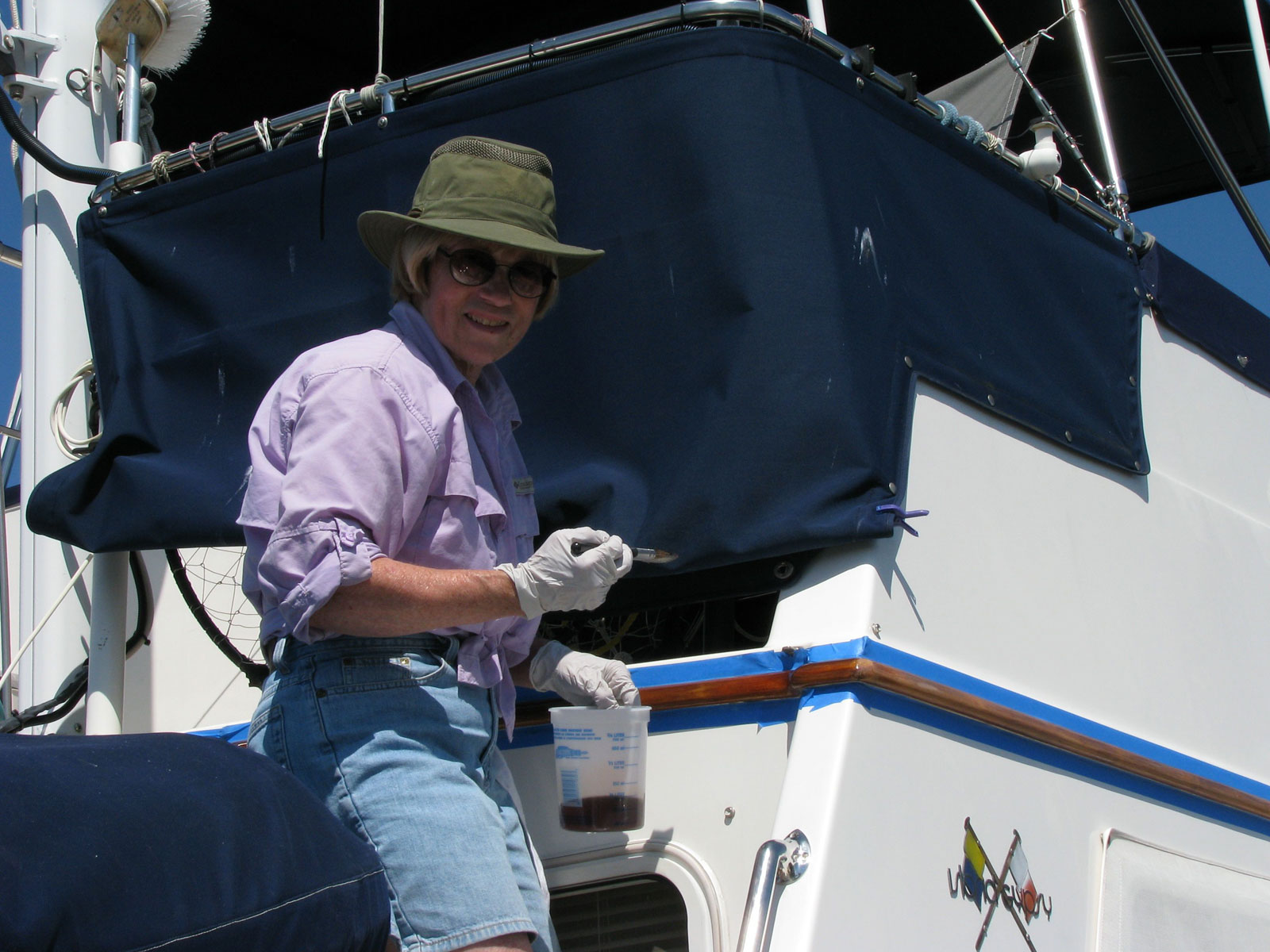 Our recent days have been filled with the annual maintenance of exterior teak…varnishing. Our boat’s exterior teak consists only of a cap rail around the decks and an eyebrow trim piece around the flybridge. Doesn’t sound like much, but the sanding, taping, and application of the varnish takes several hours for each coat…and we try to put on three coats each season.
