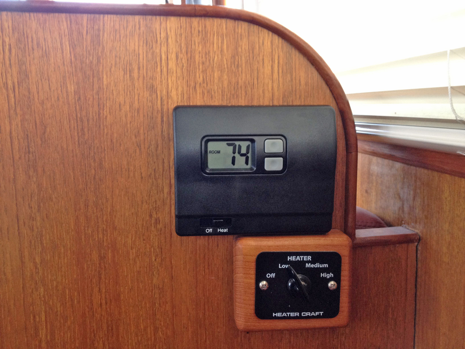 The bad thermostat had been mounted on a bulkhead where it had been a little “in the way,” so we took advantage of installing the new one in a more favorable location. Good news…it works just fine. And we’re certainly looking forward to being able to use our heater for the colder nights in September!