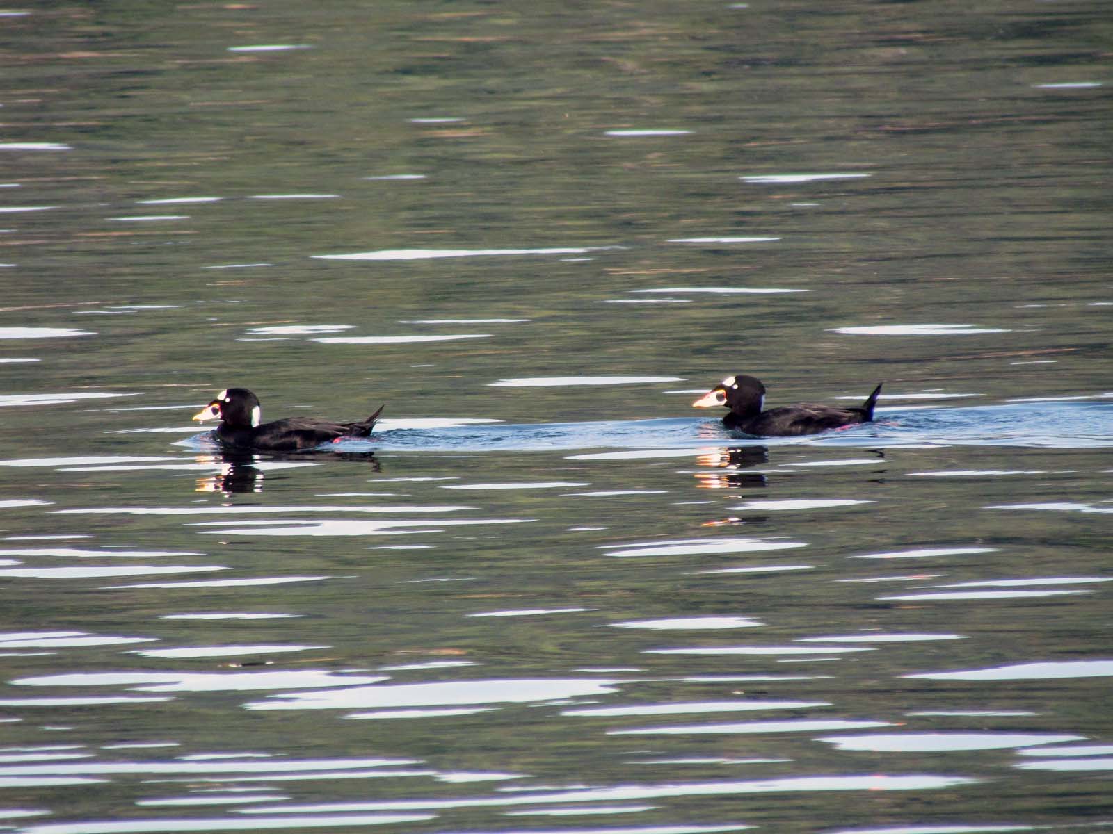 Two surf scoters hung out around our boat during the afternoon. Our bird reference says surf scoters are “large sea ducks that breed in northern Canada and Alaska, and winter along the West and East Coasts of North America.” Their nickname is “skunk-headed coot.”