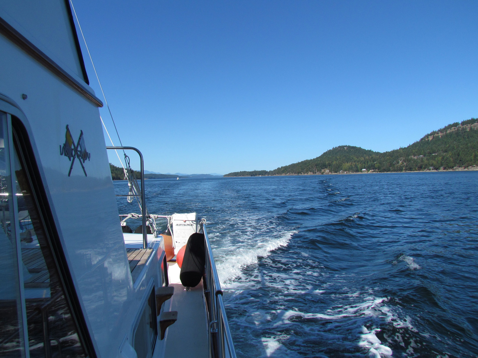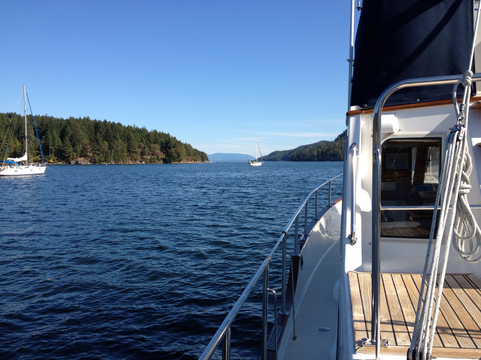 We had just enough room to back away and were able to turn around so that we didn’t have to back out the fairway. We had to be back in Anacortes in 4 days, so figured we’d start working our way south. On the way north, we enjoyed the passage through Navy Channel and Plumper Sound, so looked up possible destinations in our Dreamspeaker Guide of the Gulf Islands for anchorages along that course, and decided to try a new place tonight — Port Browning, on North Pender Island.