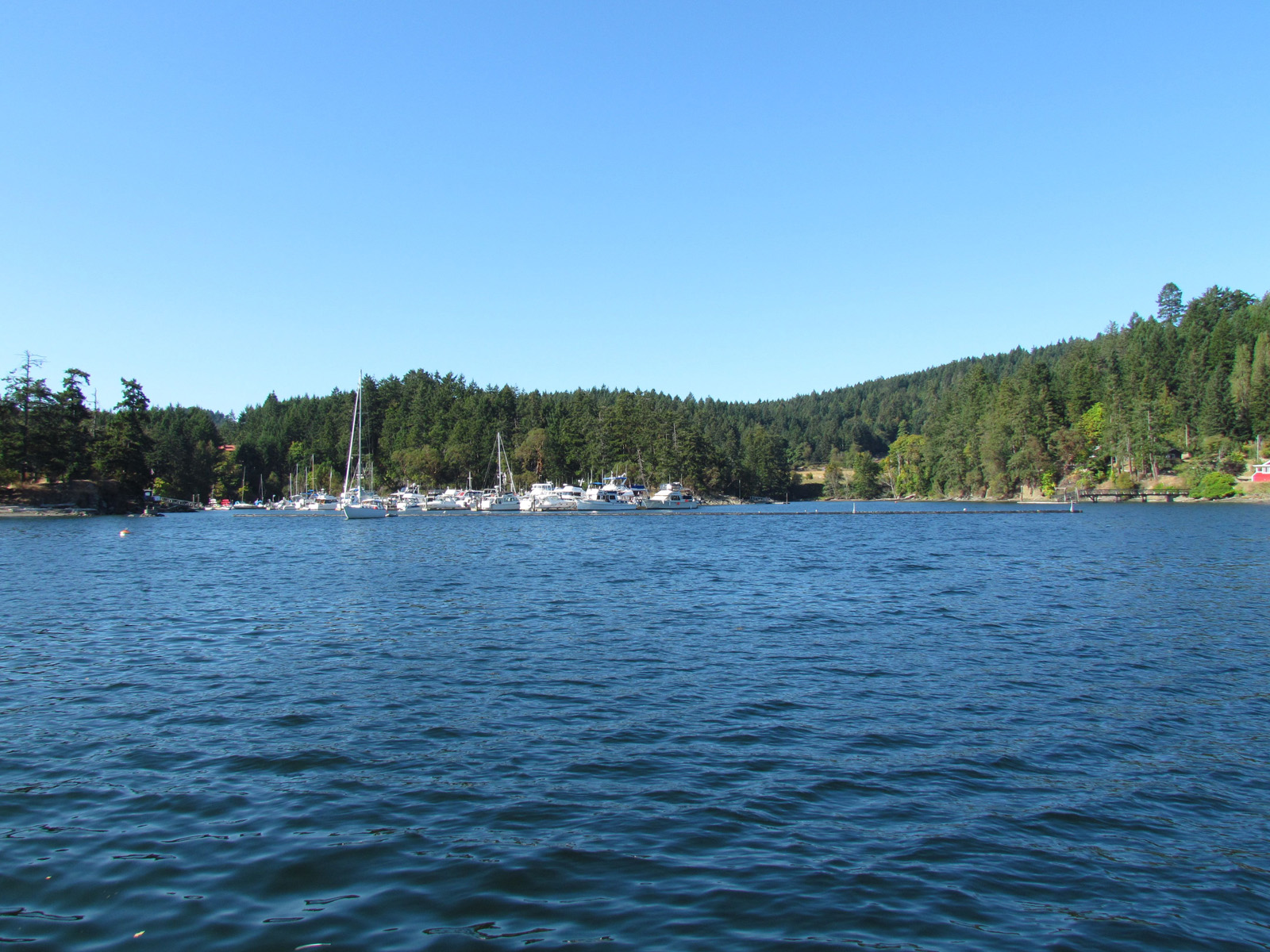 This is the view of Port Browning Inlet, looking out toward the southeast. North Pender Island is on the left, and South Pender Island is on the right. Saturna Island is in the distance.