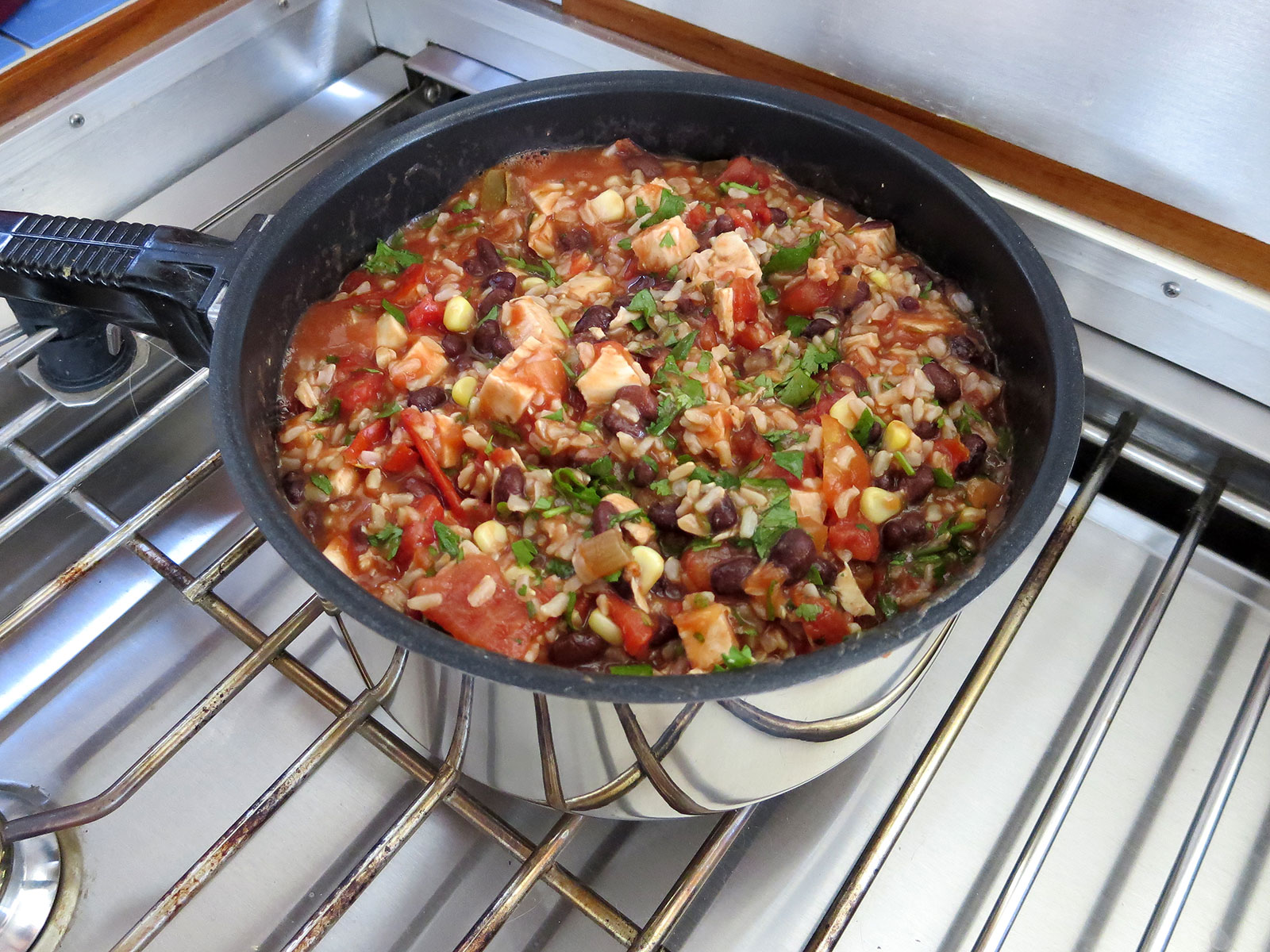 When we provisioned this week, I bought ingredients for my recipe for Chicken With Black Beans and Rice, intending to make it when we were underway. It’s a good cruising recipe, because it makes about 10 servings and reheats great. I decided to make it tonight, instead of waiting until we were out cruising. First time I’ve made it on the boat this year, and it tasted great…perfect for this evening. I served slices of avocado and sourdough bread with it. We like to add a little heat to it, and pass Cholula Original Hot Sauce when serving.