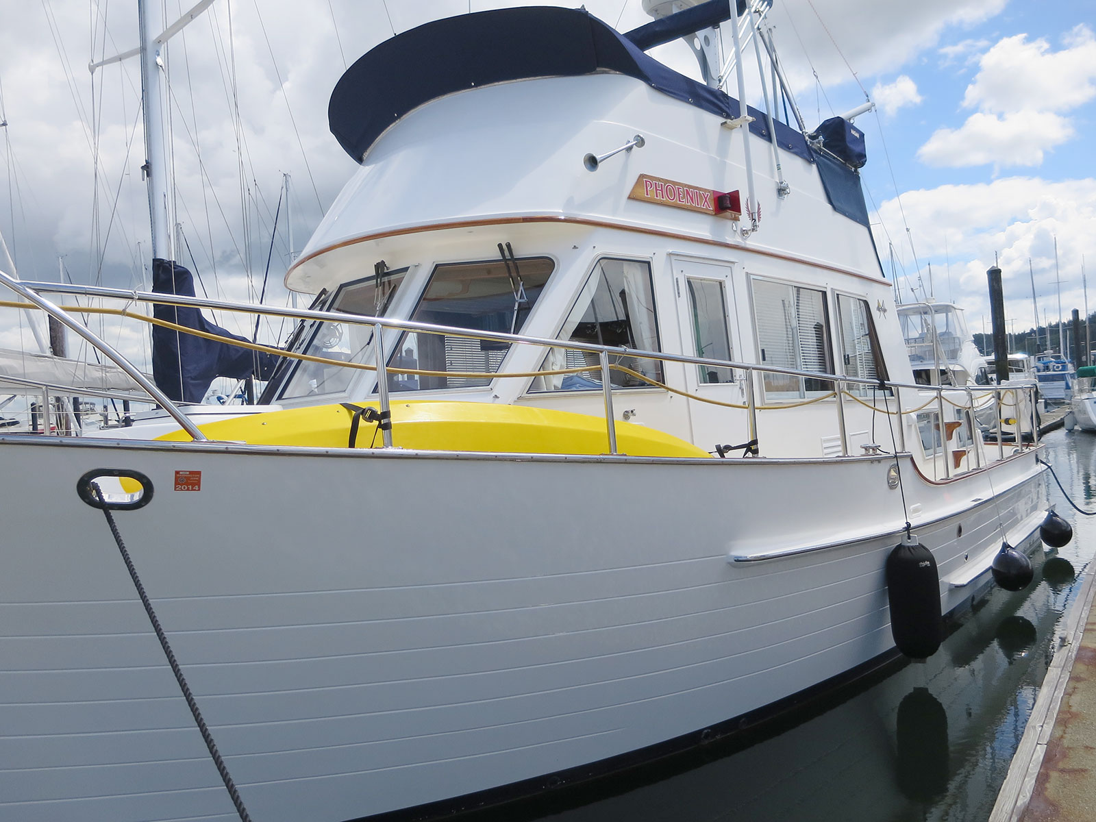 After the morning’s brief showers and clouds, the weather turned sunny, but cool for the rest of the day. Jim put the 2014 registration decals on our hull and worked on setting up his ham radio and APRS tracker. I used the time to work on organizing lockers and catch up on some computer projects, including working on this blog.