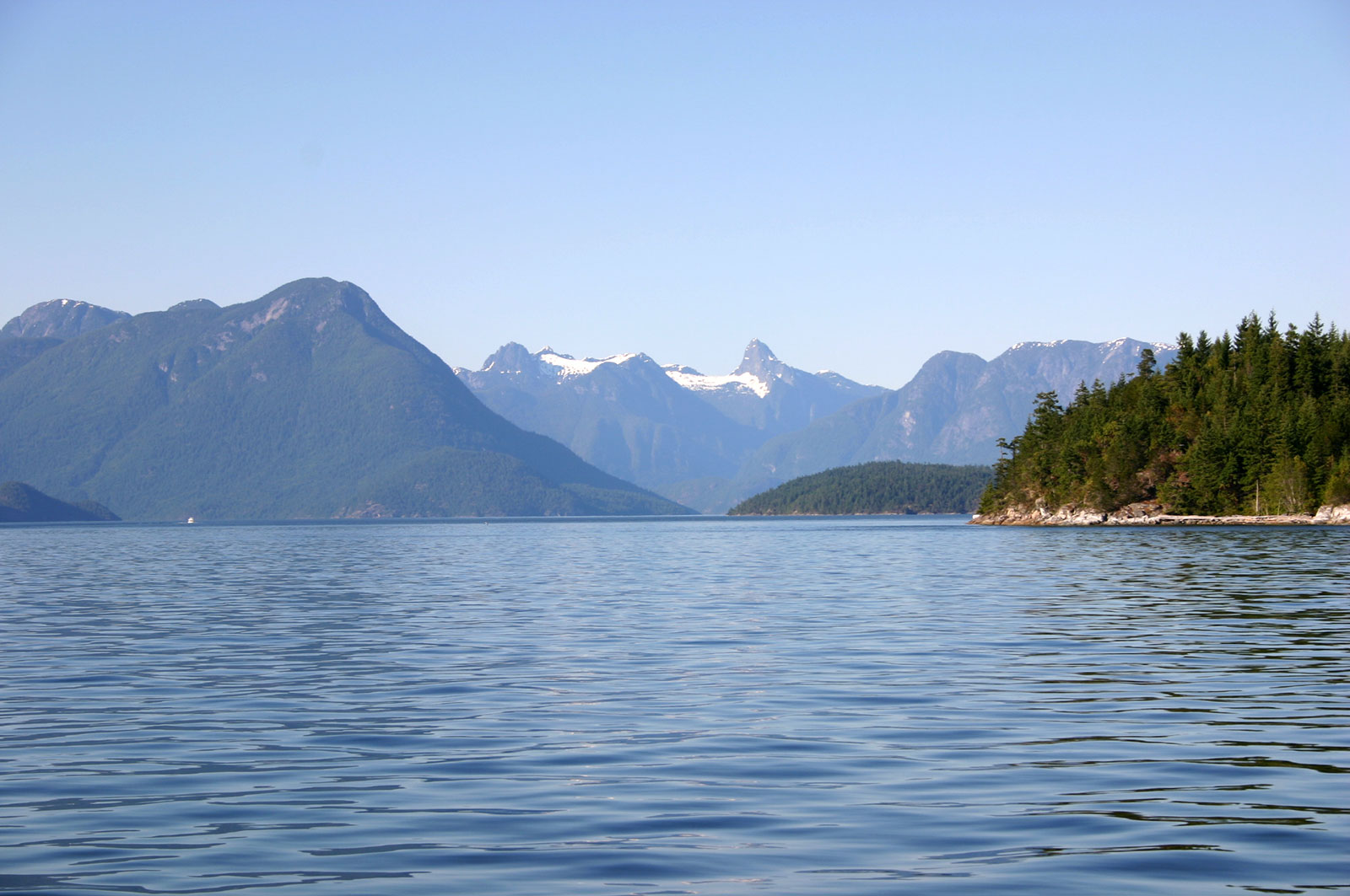 When we entered Desolation Sound in 2004, we had this spectacular view of the B. C. mainland mountains that lie behind the waters of Desolation Sound. Sarah Point is on the right.