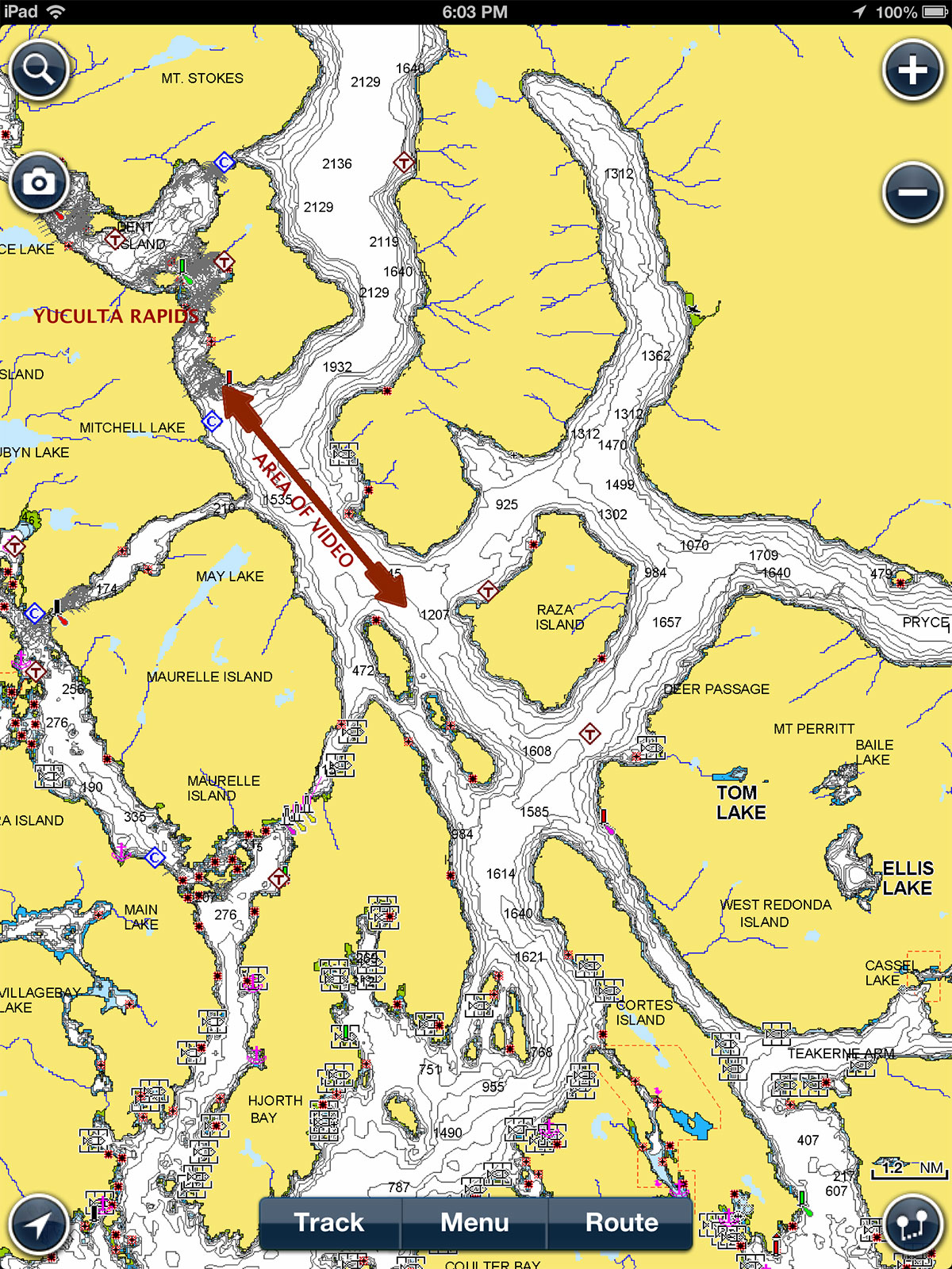 This video was taken looking east toward mainland B.C. It starts looking south in Lewis Channel, with Cortes Island on the right and West Redonda Island on the left. As it pans forward, Raza Island appears in the foreground on the right, and then Raza passage is visible between Raza Island and the B. C. mainland. The video ends as we approach Yuculta Rapids with the entrance to Butte Inlet on the right, then Stuart Island ahead, and finally Sonora Island on the far left. Here is a screen shot from my iPad of the area chart covered by the video: