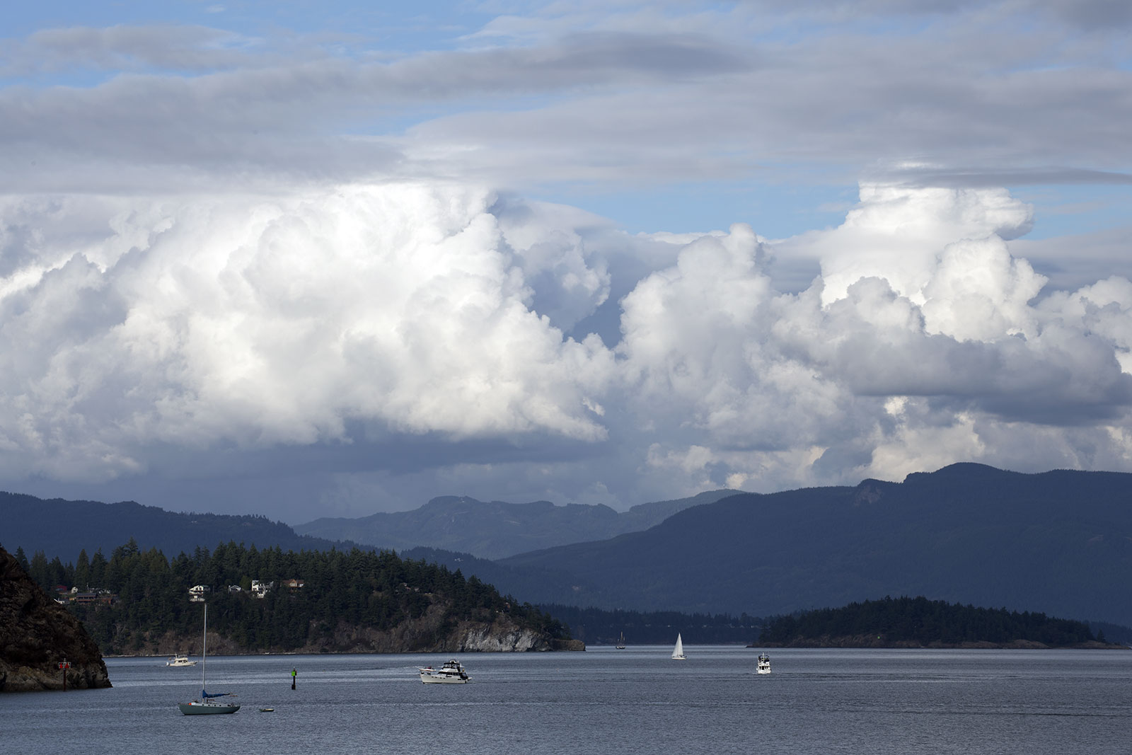 The storm clouds built Saturday evening in advance of a strong windstorm that blew through on Sunday. This photo was taken from the Anacortes shoreline looking east. Cap Sante is on the far left.