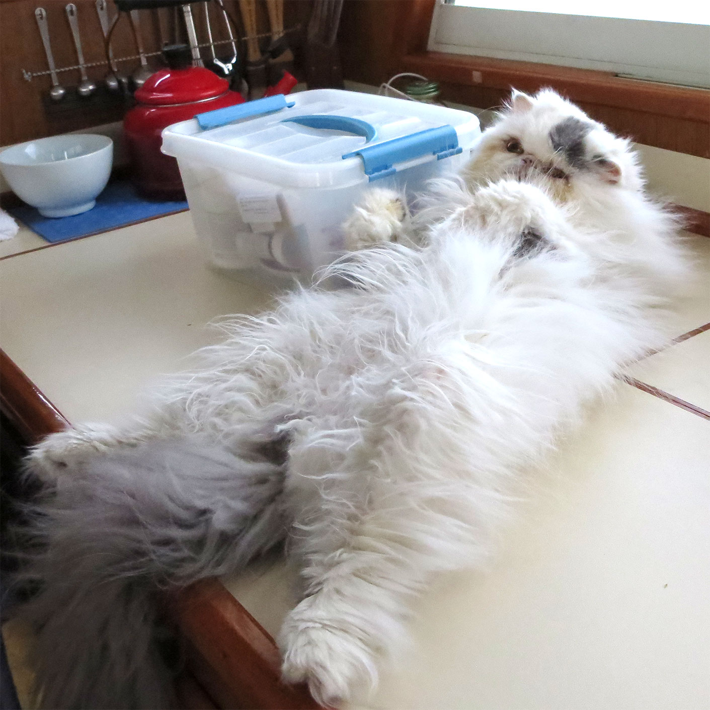 Mickey loves to relax on his back on top of the galley counter and let it all hang out!