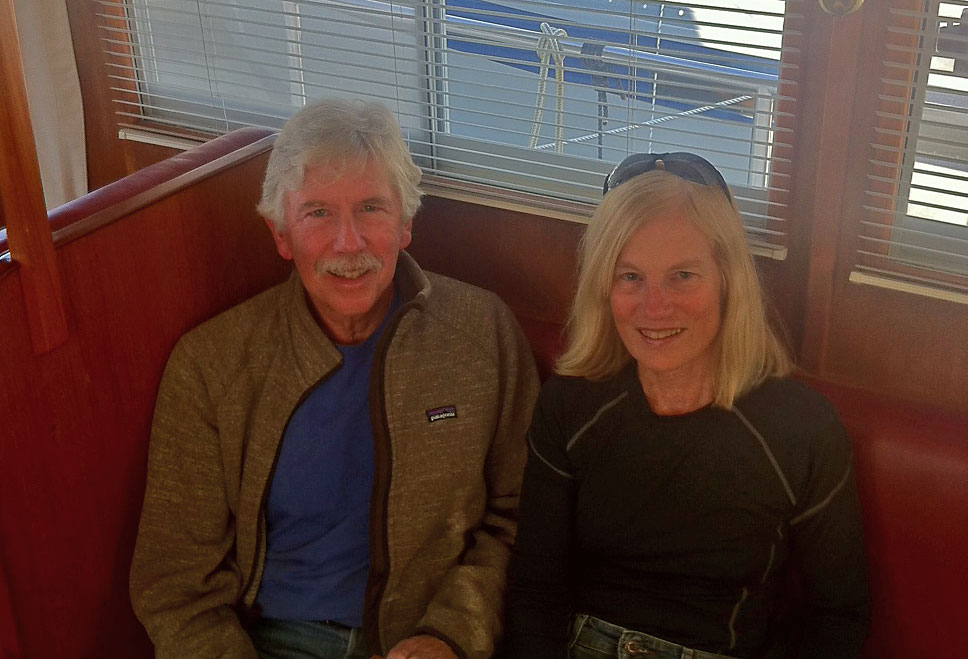 Here we are, Jim and Alice, in the main cabin of Phoenix. We were visiting with new boating friends David and Marilyn who had discovered us through this blog. Thanks for the photo, David!
