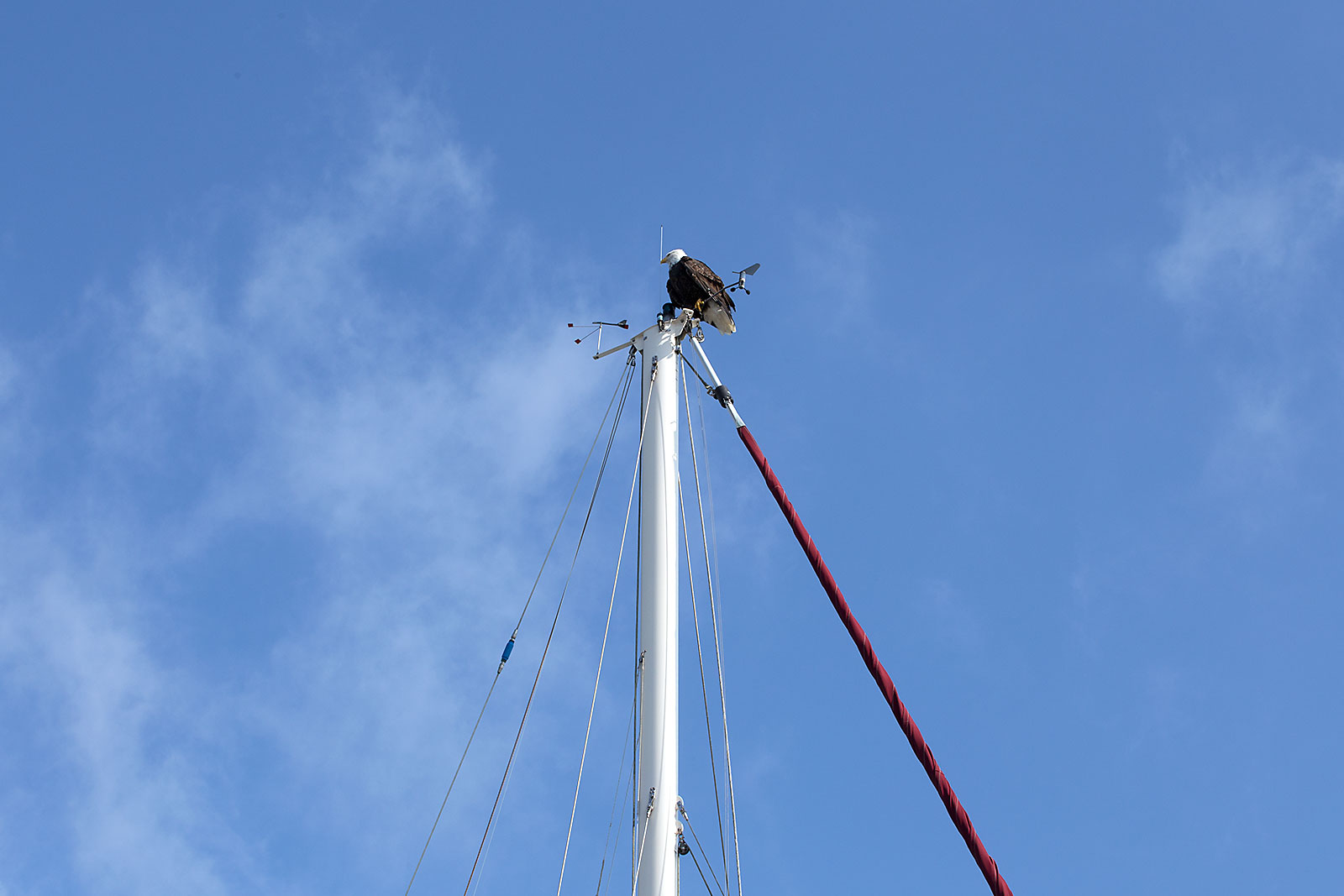 I caught this bald eagle on a sailboat mast near our boat. The eagle is standing on the masthead-mounted wind instruments. Can’t be too good on that equipment!