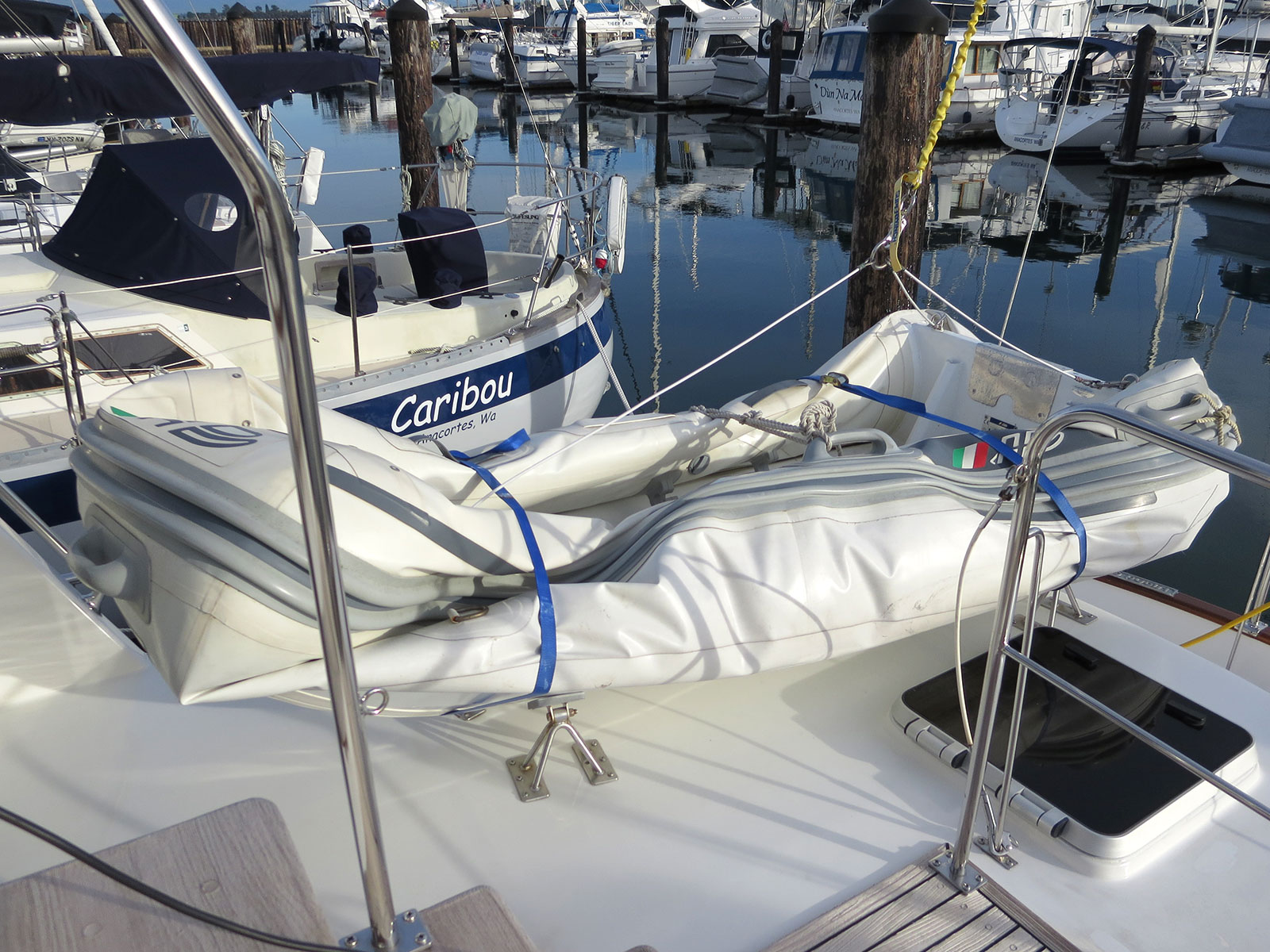 We deflated the dinghy and tied it up with straps to get it off the boat deck. We used our electric winch to transfer the dinghy from the boat to a cart on the dock.