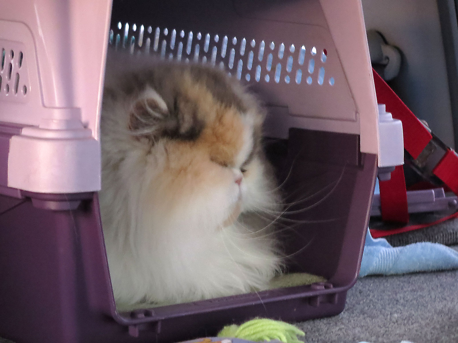 Our kitties are great car travelers. We’re so lucky! Mickey likes to sleep on the console between the two front seats.