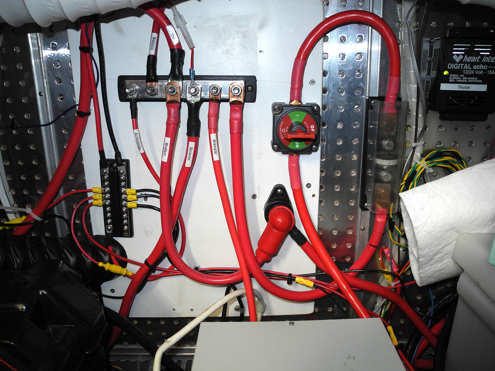 Jim down in the engine room is tightening one of the nuts on the bus bar that attaches the battery cables to the positive distribution board.