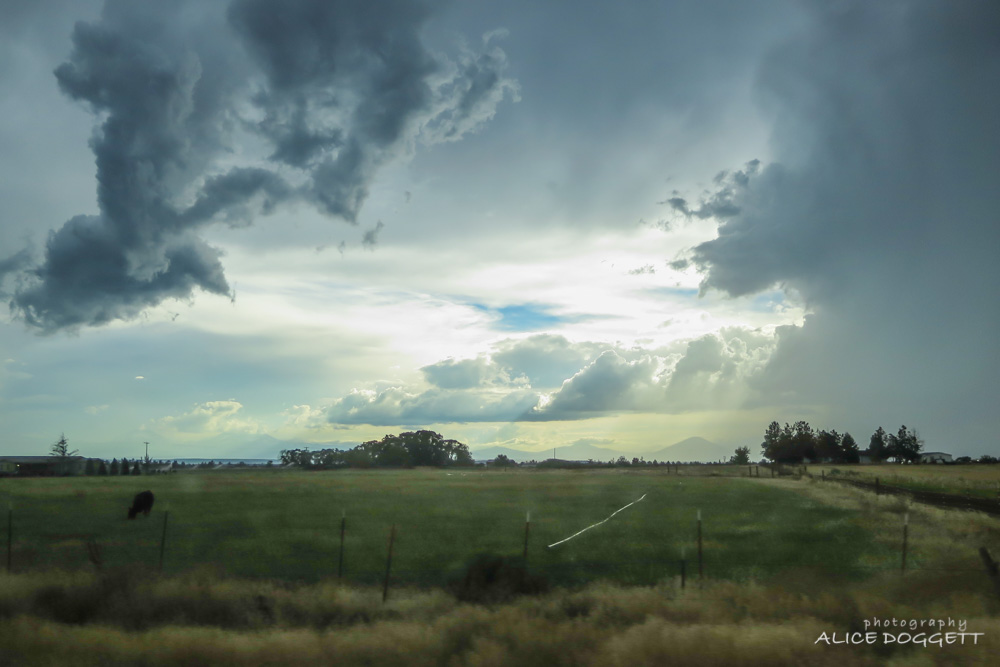 The day we drove back from Anacortes to Bend, there were severe thunderstorm warnings posted throughout Central Oregon. We were lucky and encountered only one of the thunderstorm cells, which dumped heavy rain on us and had strong winds with a bit of lightning. The sky was dramatic with tall, dark clouds in the cells and clearing between cells. There were reports of large hail, heavy rain, strong wind, and lightning strikes all over the area, and we were glad to get home without incident!