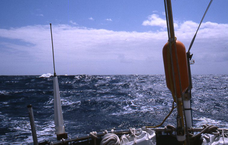 Watching the film “Life of Pi” made us remember experiences we had while ocean sailing. Here we are sailing to Hawaii, and looking back over our stern you can see the breaking waves and sea foam blown by the wind. At least it was a favorable wind behind us!