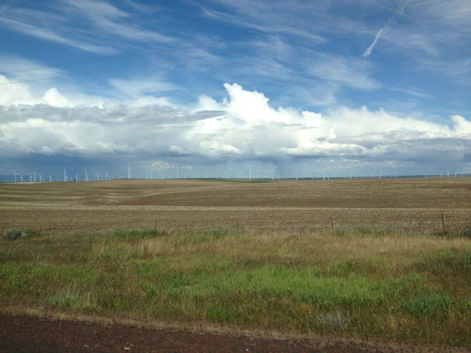 Hundreds of wind turbines line the horizon looking toward the Columbia River Gorge.