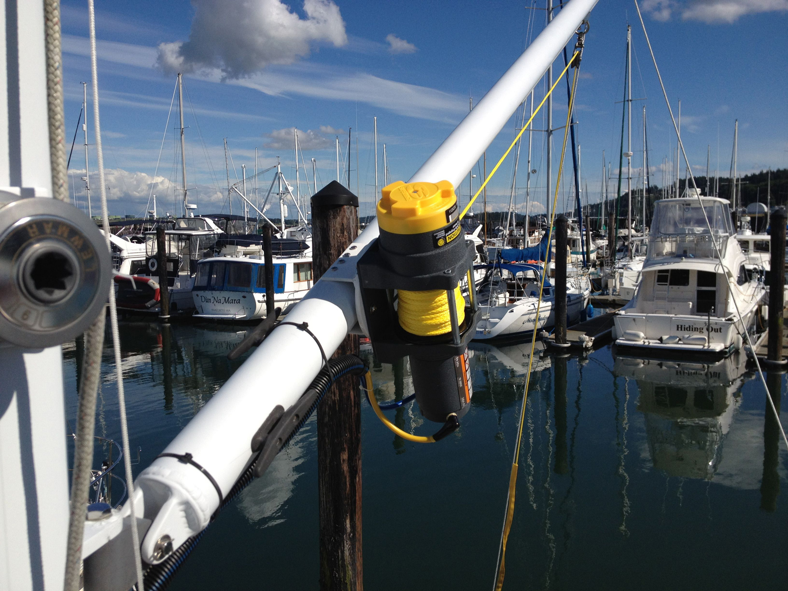 In the past, we’ve lifted the outboard from the dock slowly by cranking the manual winch, but today we let the Superwinch do the job. It quickly got the outboard up and onto the deck where Jim could attach it to the dinghy. Neat! We’re very pleased with how our new system performs.